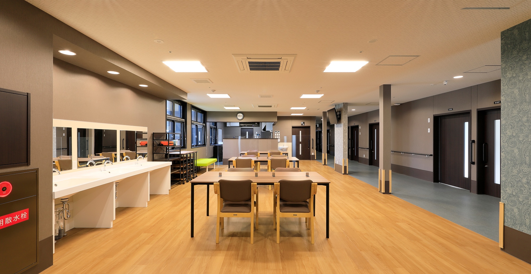 温かい木目で統一されたインテリアと心地よいJAZZが流れる空間となります。お食事はもちろんトレーニングやリハビリもこちらのスペースにて行います。