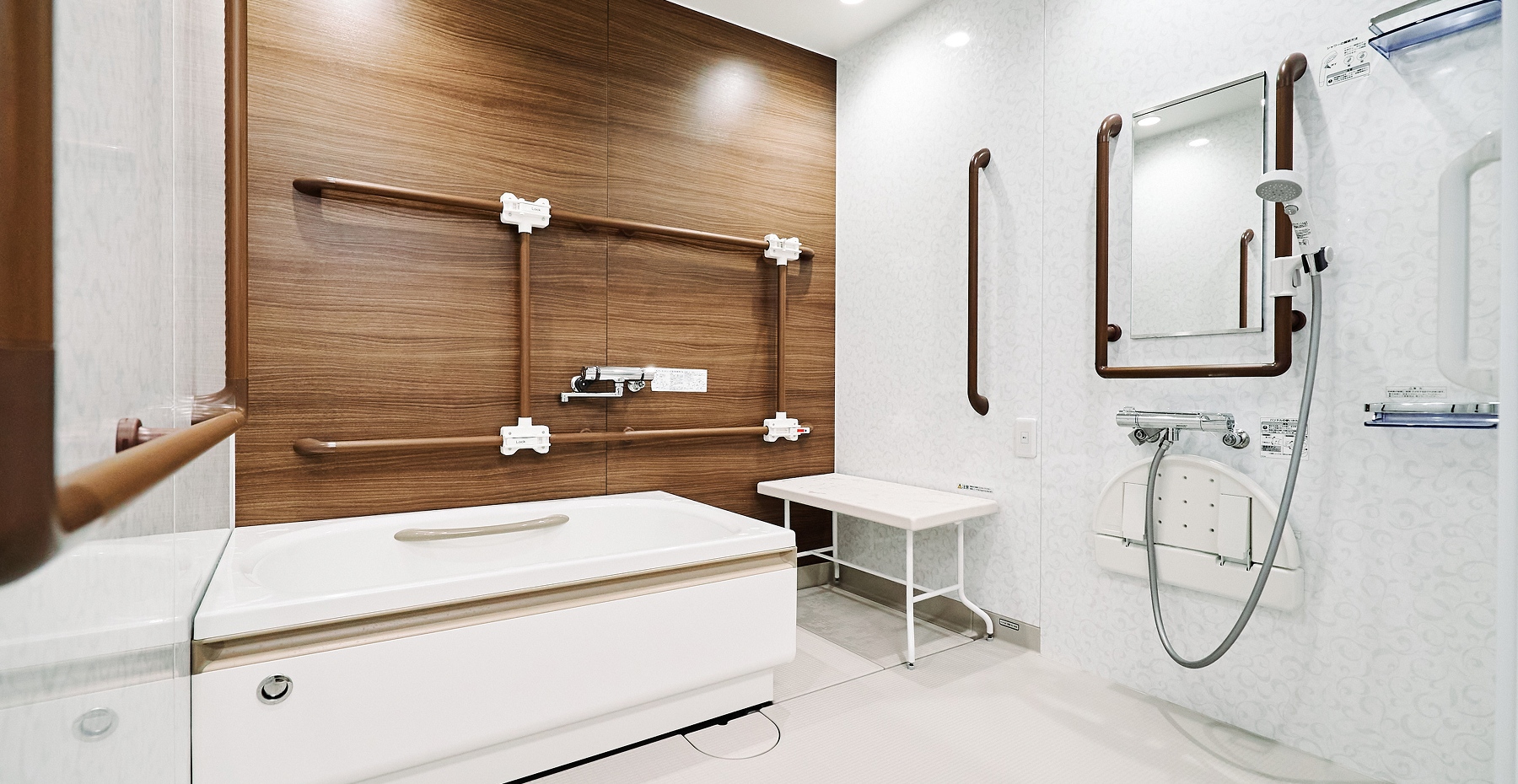 feature06自立・または介助での浴槽が可能な方は、こちらをご利用いただくことが可能です。最新モデルタイプの浴室となっており、安全を考慮したバリアフリーや福祉用具を導入しております。お身体の状態を考慮しながらご希望に応じて受付けております。