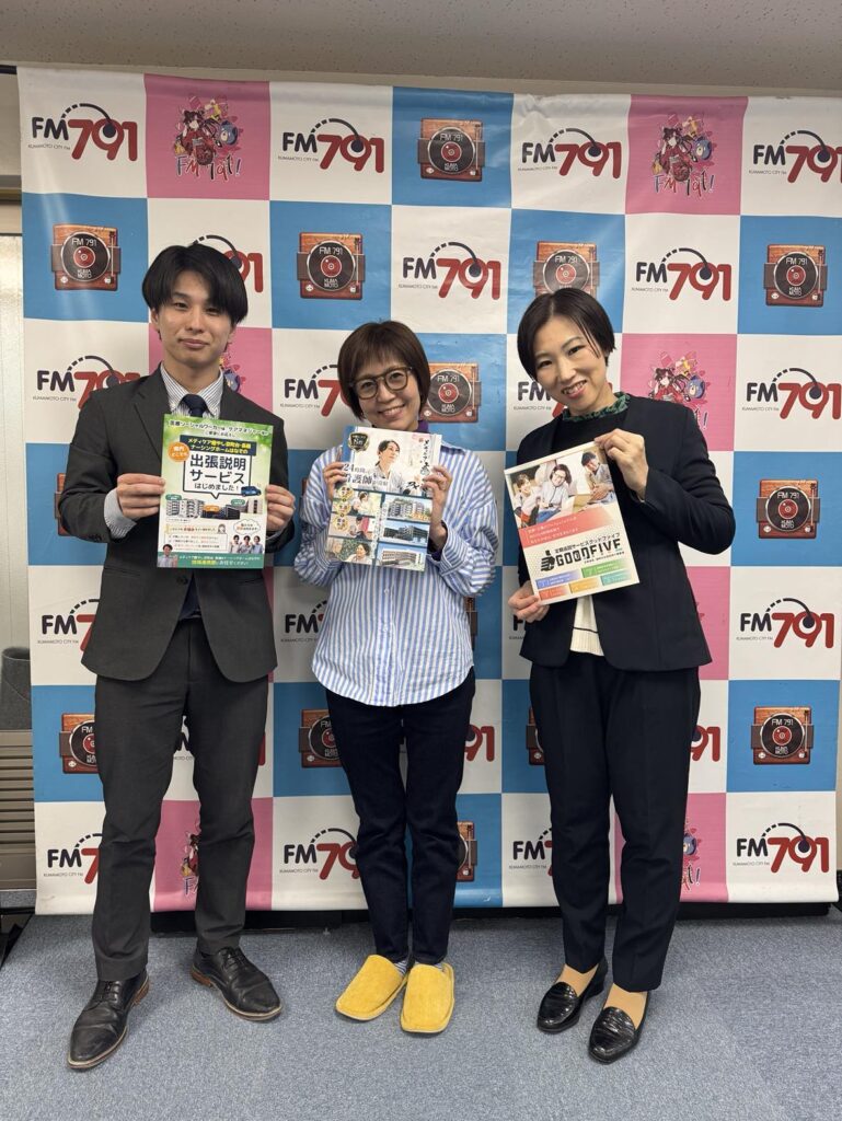 2025年1月、当施設は「ナーシングホームはなぞの」から「メディケア癒やし花園」へと施設名を変更し、このことをより多くの方に知っていただくために、スタッフがラジオ番組「熊本シティエフエム」に出演しました。番組では、入居に関するご相談やご家族様の不安に対するサポートを行っていることを紹介し、また施設のスタッフの8割以上が医療従事者であることなど、安心して過ごしていただける環境を提供している当施設の魅力をお伝えしました。